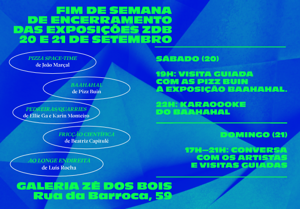 On September 20 and 21, we will have a closing weekend for the exhibitions Pizza Space-Time (by João Marçal), Baahahal (by Pizz Buin), Pedreiras/Quarries (by Ellie Ga and Karin Monteiro), Fricção Científica (by Beatriz Capitulé), and the exhibition at the bookstore Ao longe endireita (by Luís Rocha).