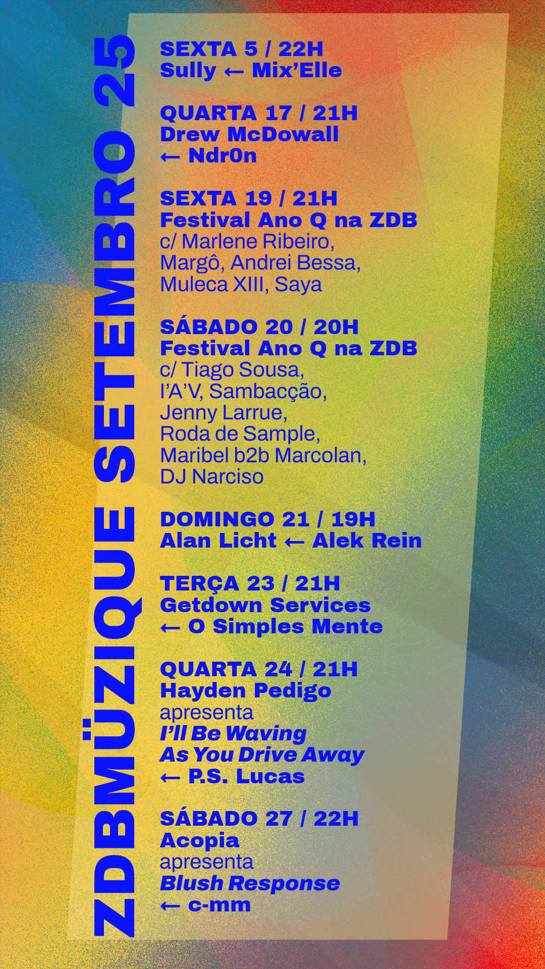 O ANO Q 2025 reúne uma seleção diversificada de projetos artísticos que desafiam as fronteiras do mainstream através da sua prática. A programação cultural deste festival representa a resistência directa aos eventos baseados em lucro, procurando oferecer uma alternativa ao mainstream de uma Lisboa cada vez mais gentrificada, onde uma polida padronização cultural imposta de cima ou de fora se tornou a norma.